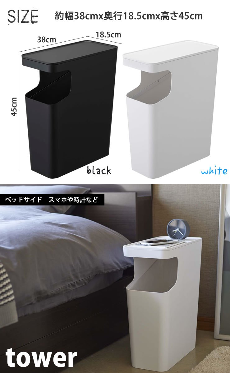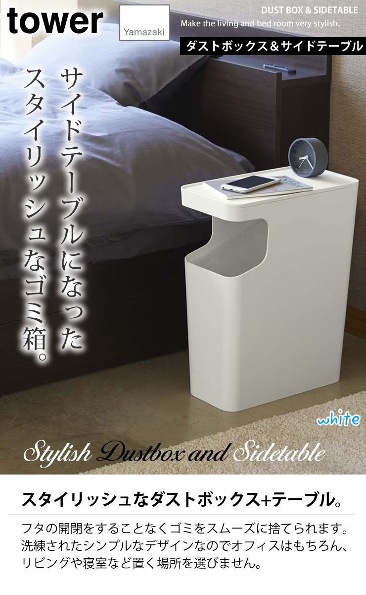 ダストボックス&サイドテーブル タワー(tower) / 山崎実業 YAMAZAKI 仕様 サイズ:約幅38cm×奥行18.5cm×高さ45cm(内容量約15L) 付属品:袋止めリング(粉体塗装スチール) 耐荷重:約5kg 材 質:ABS樹脂 デザイン:日本/原産国:中国 ※WEB上のため、実物と画像の色が、多少違う点がございます。